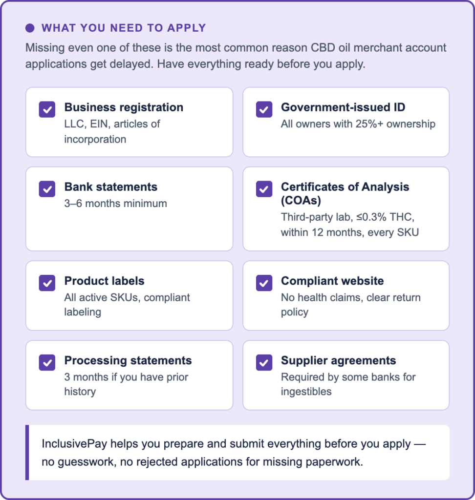 Business registration, owner ID, 3–6 months of bank statements, current COAs for every product, product labels, compliant website. For ingestibles, some banks also require supplier/manufacturer agreements. See our CBD merchant account requirements guide for the complete breakdown.