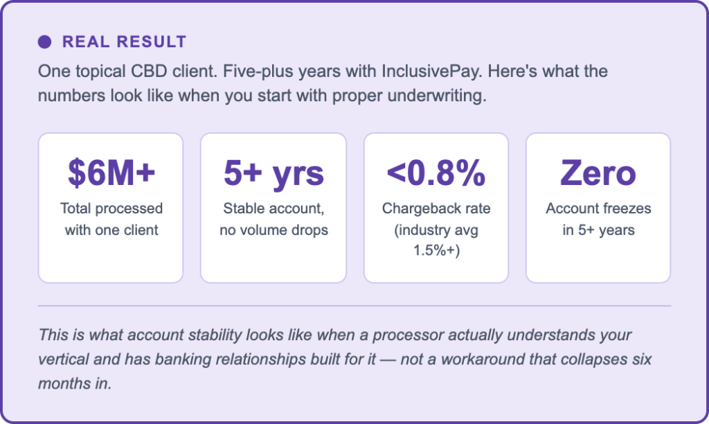 InclusivePay has been placing CBD oil merchants since 2018. If you want a straight answer on whether we can help with your specific product catalog, reach out here — no application fee, no pressure.