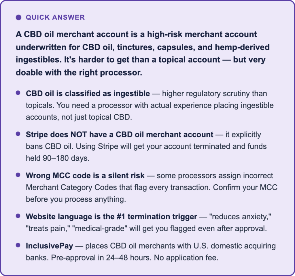 If you sell CBD oil — tinctures, capsules, softgels, gummies, edibles — you already know payment processing is harder than it is for topicals. Banks and underwriters treat ingestibles differently. The regulatory exposure is higher, the chargeback potential is higher, and the list of processors willing to touch it is shorter.