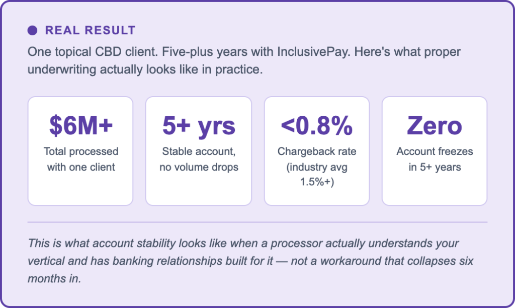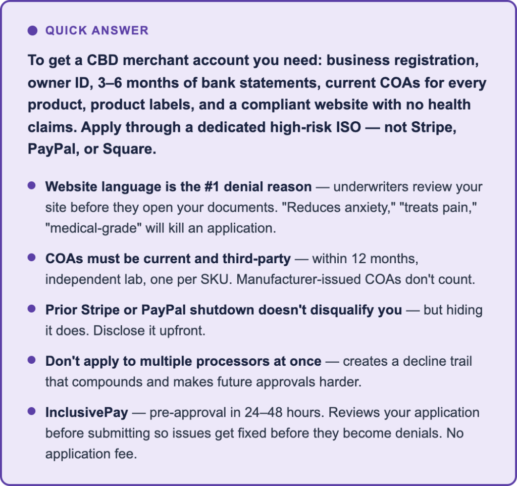 InclusivePay has been placing CBD merchants since 2018. If you want us to review your application before you submit it, reach out here — no application fee, no pressure, just a straight answer on whether everything looks good.