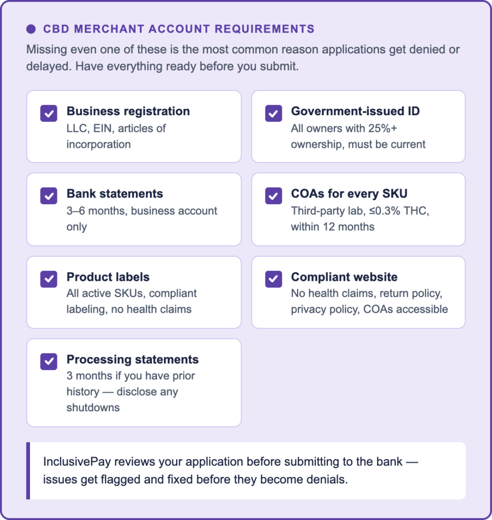 Business registration (LLC, EIN), government-issued ID for all owners with 25%+ ownership, 3–6 months of business bank statements, current COAs for every product (third-party lab, ≤0.3% Delta-9 THC, within 12 months), product labels, and a compliant website with no health claims. Processing statements from any prior processor if you have them. For ingestibles, some banks also require supplier/manufacturer agreements.