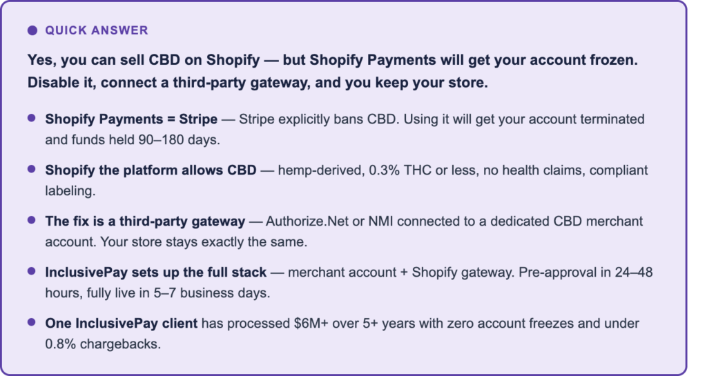 Shopify is a great platform for CBD. The storefront, the inventory tools, the app ecosystem — all of it works. What doesn’t work is Shopify Payments, and that’s where most CBD brands run into trouble.