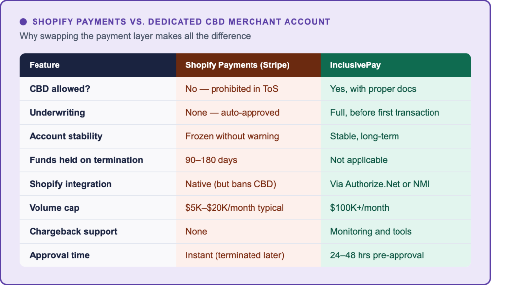 This is the trap. Shopify Payments approves you instantly with no underwriting. Your store goes live, you start processing, everything looks great for a few weeks or months. Then Stripe’s risk algorithms detect CBD in your product descriptions and your account gets flagged. No human reviews it. No warning. Account frozen, funds held for 90 to 180 days, possible MATCH list placement.