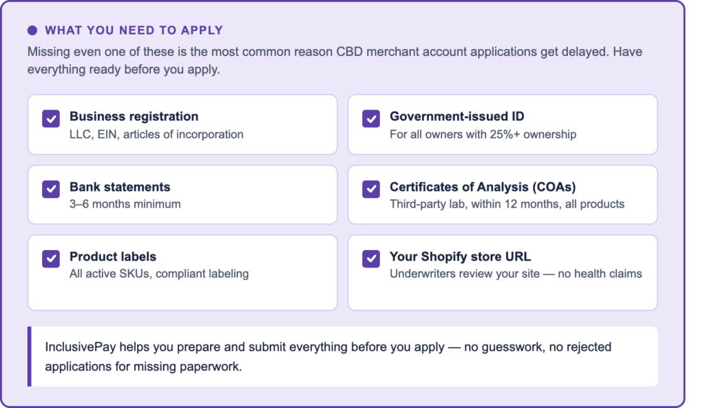 Approval timeline: With InclusivePay: pre-approval in 24–48 hours for most CBD merchants. Fully live with your Shopify gateway connected in 5–7 business days.