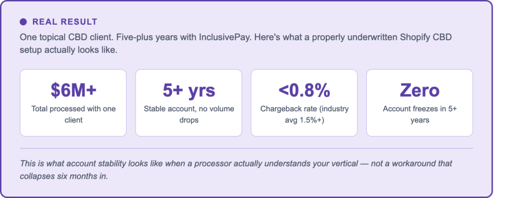 | REAL RESULT One topical CBD brand has processed over $6M with InclusivePay across 5+ years. No volume drops. Chargebacks held under 0.8%. Never frozen. That’s what a properly underwritten Shopify CBD setup looks like. |