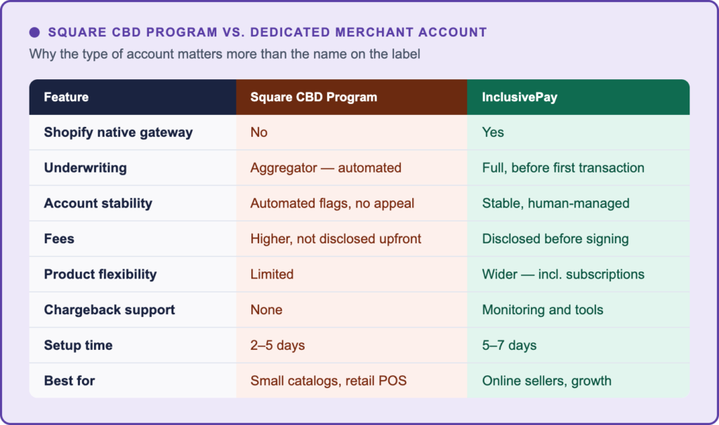 InclusivePay has been placing CBD merchants since 2018. This guide reflects what we’ve actually seen — including what Square tells you, what it doesn’t, and what happens when things go wrong.