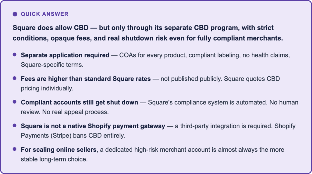 Yes — but only through its separate CBD program, which requires a specific application, product COAs, and approval before you process anything. Standard Square onboarding does not cover CBD. Processing CBD on a standard Square account before getting approved is a fast way to get flagged and frozen.