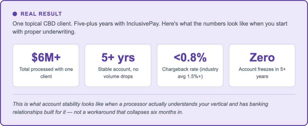 | REAL RESULTOne topical CBD brand has processed over $6M with InclusivePay across 5+ years. No volume drops. Chargebacks held under 0.8%. Never frozen. |