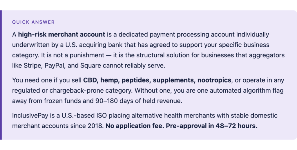 InclusivePay has been placing high-risk merchants since 2018. This guide reflects what we’ve seen work – and what blows up – across hundreds of applications in CBD, hemp, peptides, nootropics, and other alternative health verticals.
