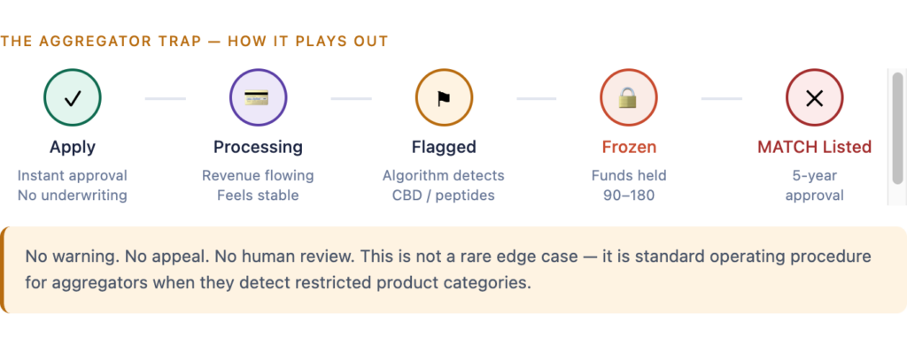 The reason most merchants don’t realize this until it’s too late is the way aggregators work. They don’t do real underwriting. They approve everyone instantly, pool thousands of merchants under one master account, then use automated risk algorithms to monitor transactions and remove anyone who triggers a flag. CBD always triggers that flag. So do supplements, peptides, subscriptions, and dozens of other legitimate business categories.