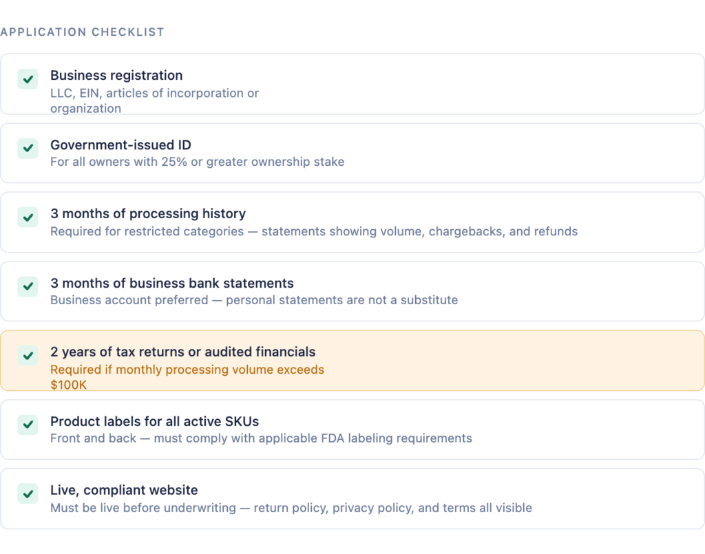 Most denials happen because merchants apply without a complete documentation stack. Have these ready: