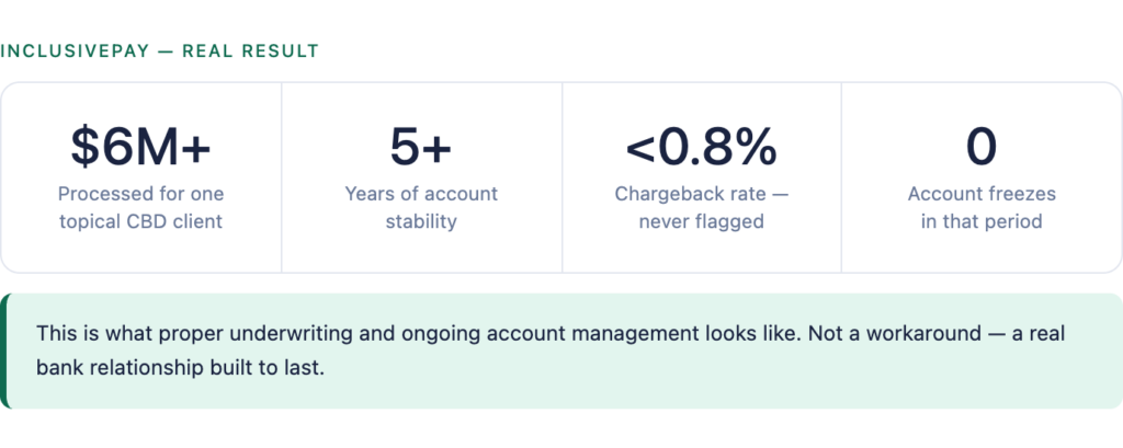 | REAL RESULT One topical CBD brand has processed over $6M with InclusivePay across 5+ years. No volume drops. Chargebacks held under 0.8%. Never frozen. |